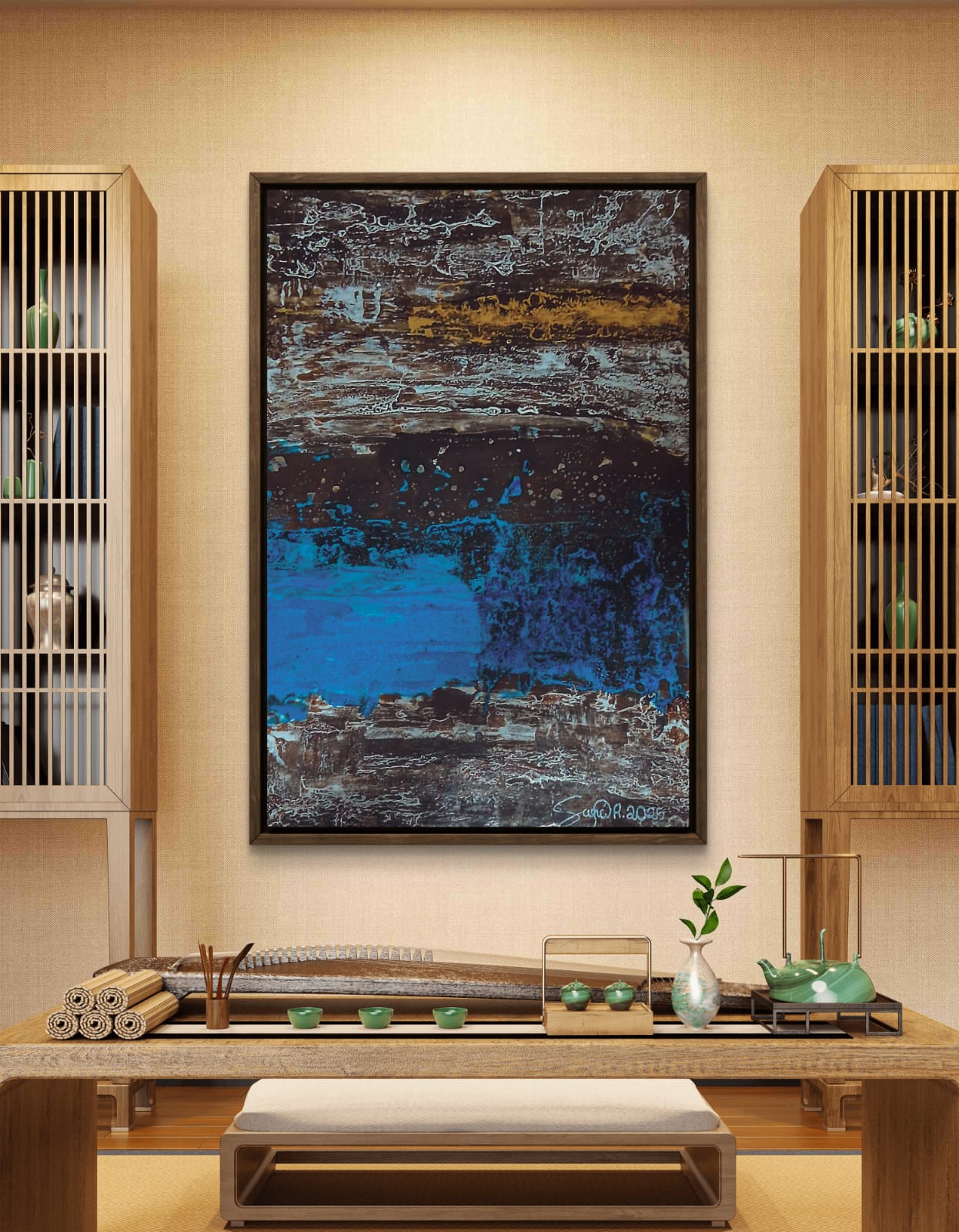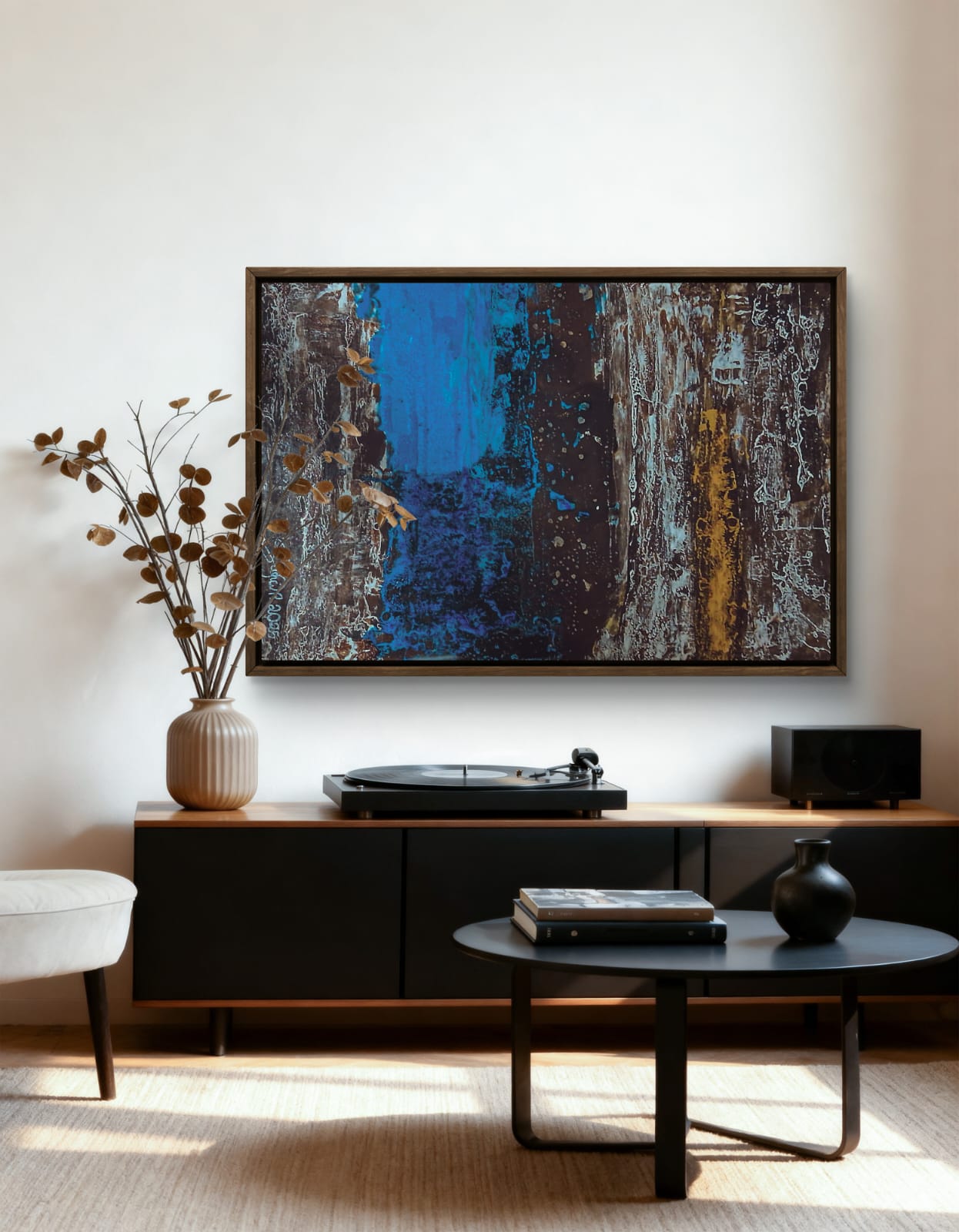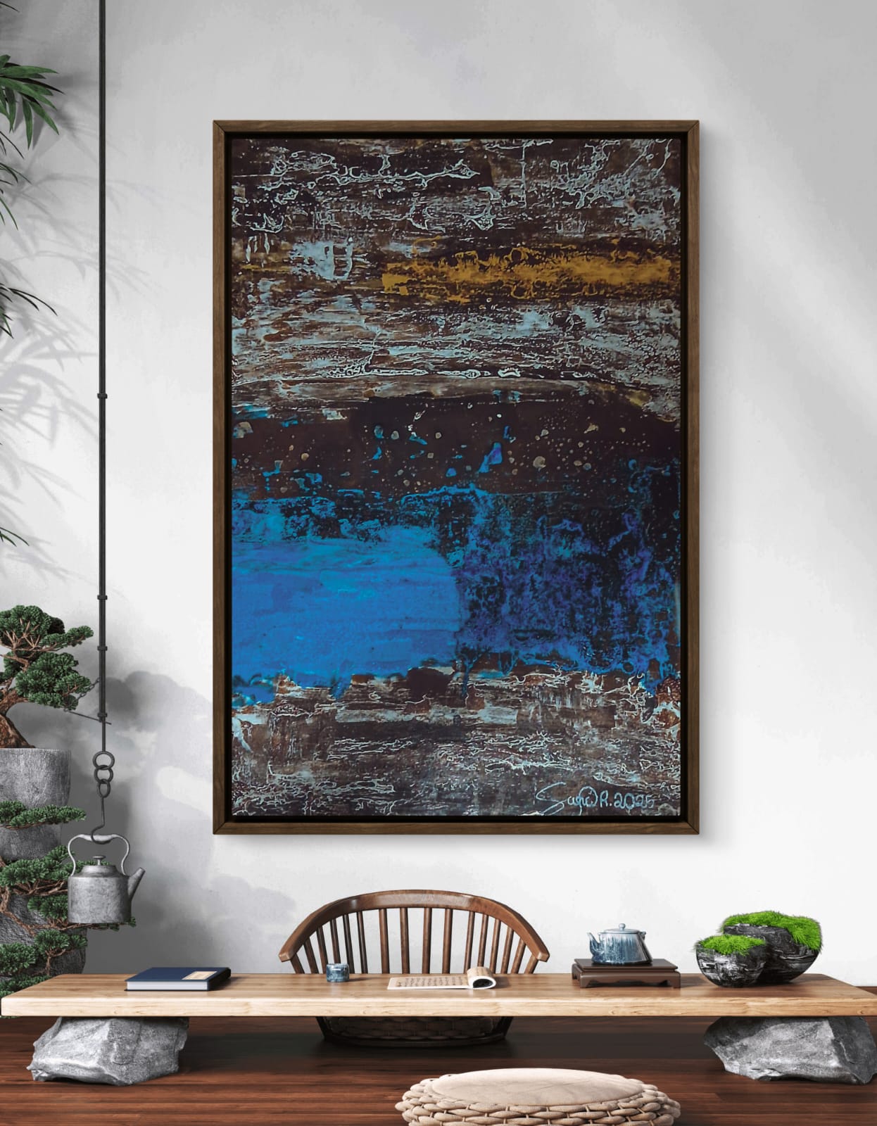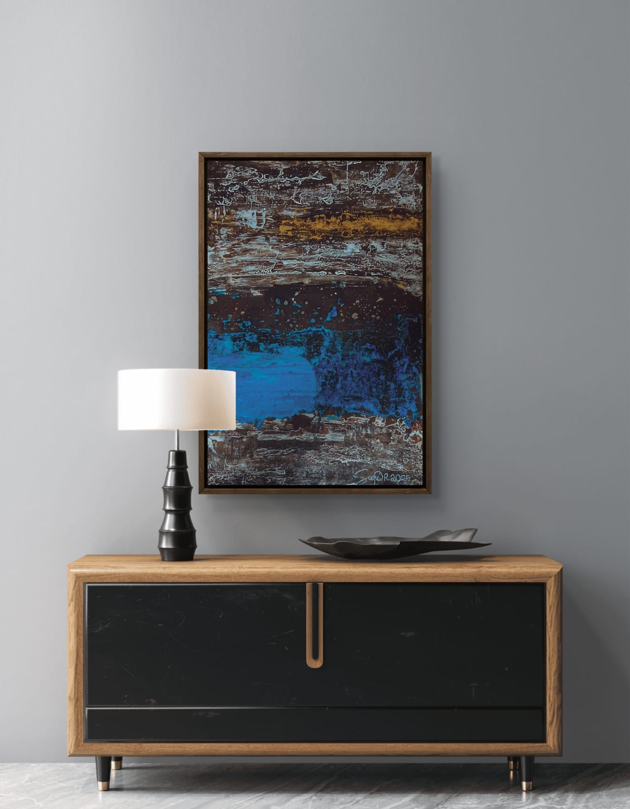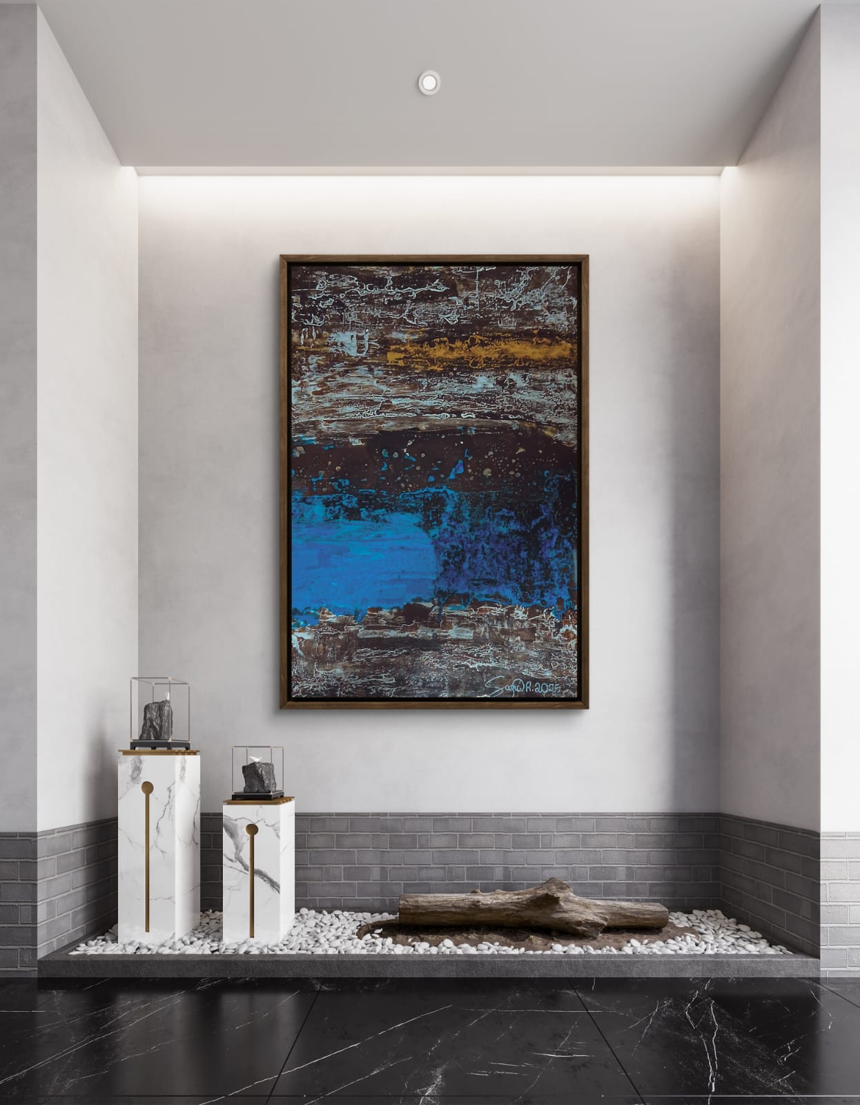 As primeiras imagens além de ser uma ilustração, é na verdade um exemplo real de como essa obra de arte pode ser usada.. é um quadro abstrato feito pela artista, Sara! Ele foi planejado para ser colocado em lugares que fizessem sentido, mas também que tivesse uma harmonia no ambiente.